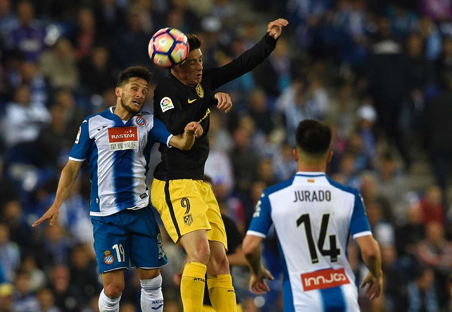 Atletico Madrid's forward Fernando Torres beating Espanyol's Argentinian forward Pablo Piatti to the ball during their Spanish league football match at the RCDE Stadium in Cornella de Llobregat on April 22, 2017.