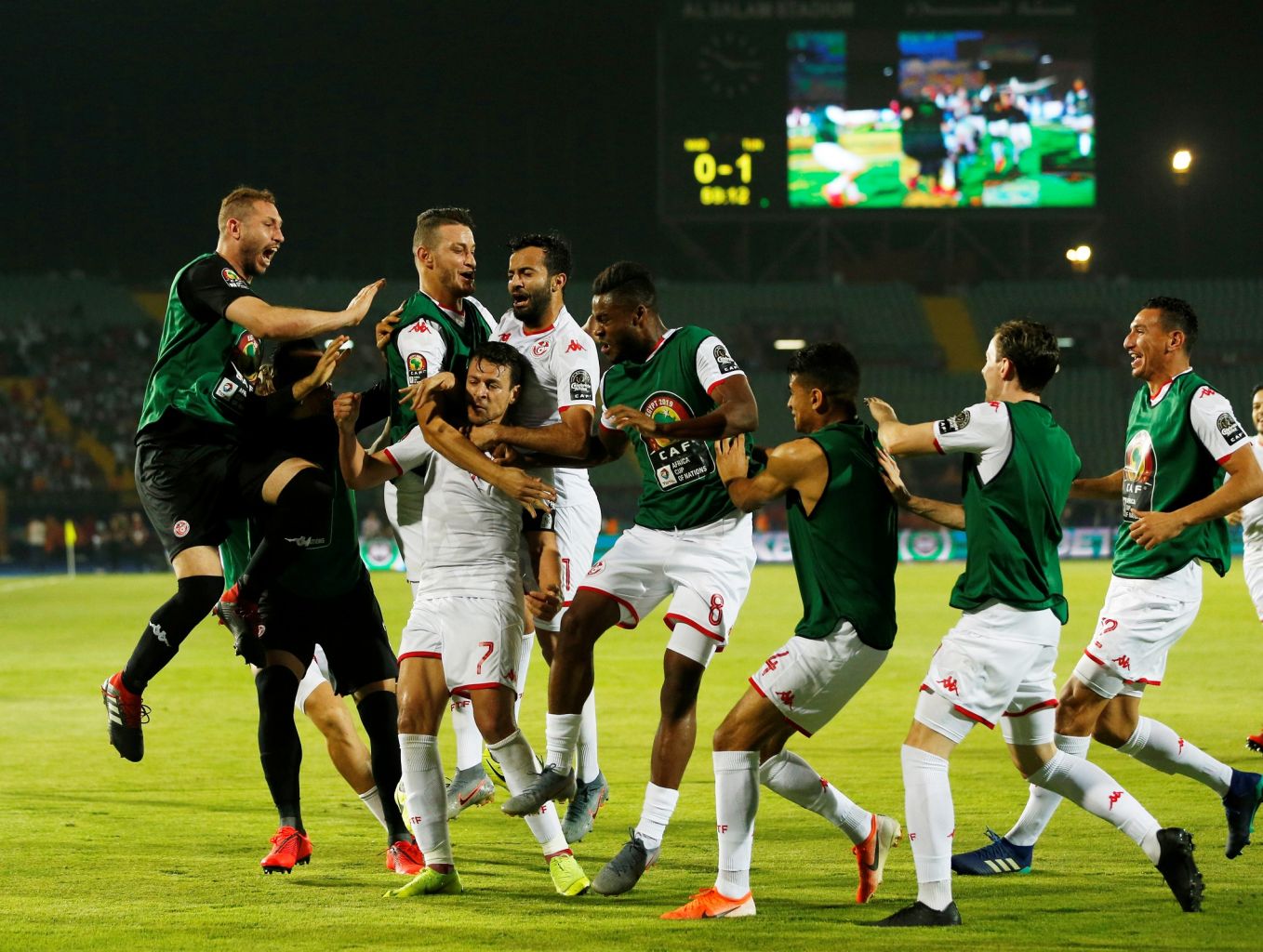 Tunisia's Youssef Msakni celebrates scoring their second goal with team mates.