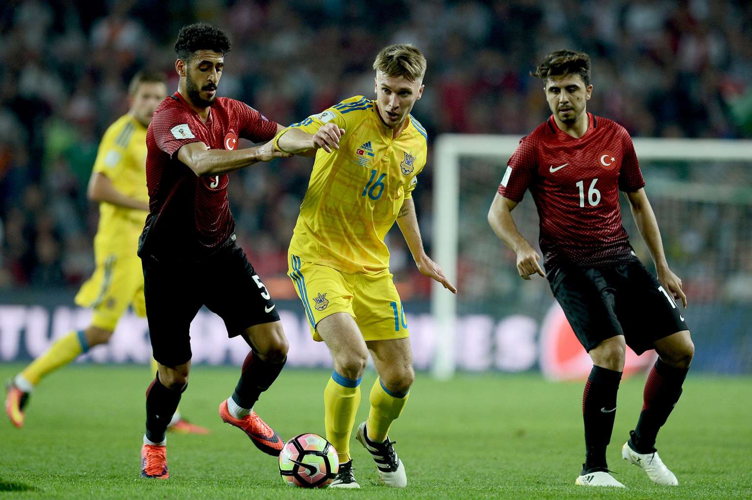 Ukraine's Serhiy Dorchuk (centre) vies with Turkey's Ozan Tuhan (R) and Tolga Cigerci (L) during the World Cup 2018 football qualification match between Turkey and Ukraine on Oct 6, 2016 at Konya arena stadium in Konya.