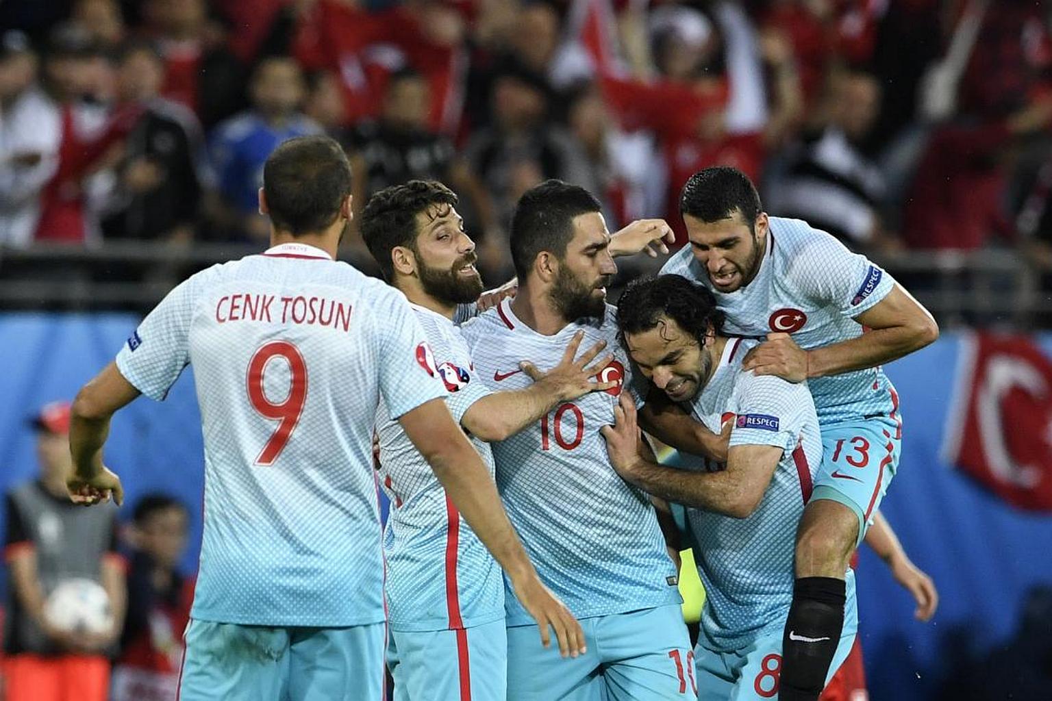 Turkish players celebrate their victory at the end of the Euro 2016 group D football match between Czech Republic and Turkey.