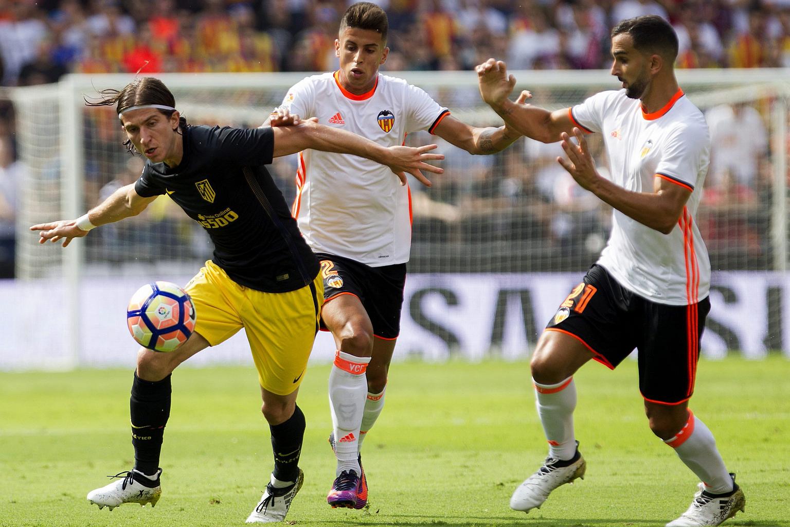 Valencia's Joao Cancelo (centre) and Martin Montoya fight for the ball with Atletico Madrid's Filipe Luis (left) during their Spanish Primera Division soccer match on Oct 2, 2016.