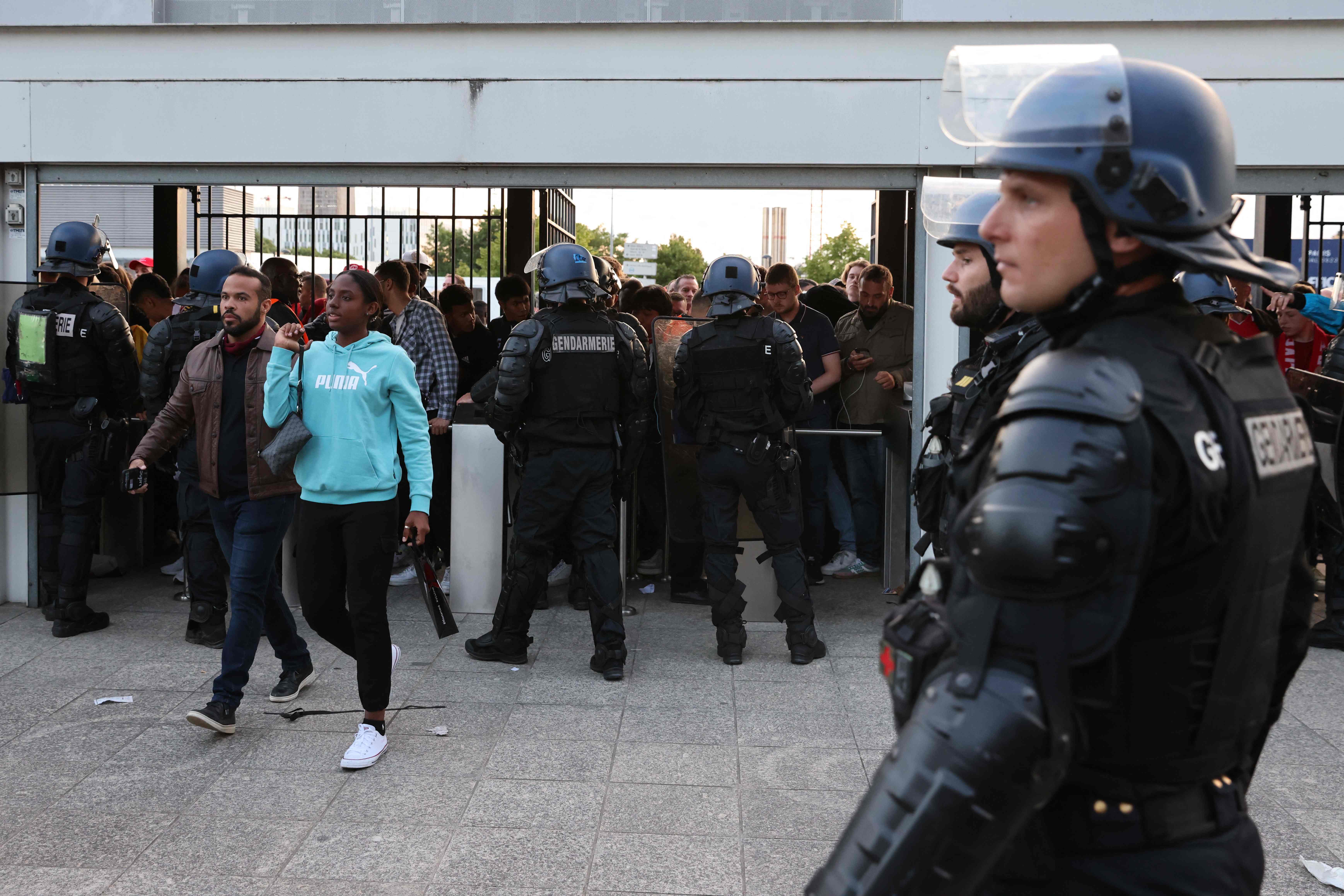 A video grab shows police officers intervening as fans climb a fence at the Stade de France before the Champions League final.