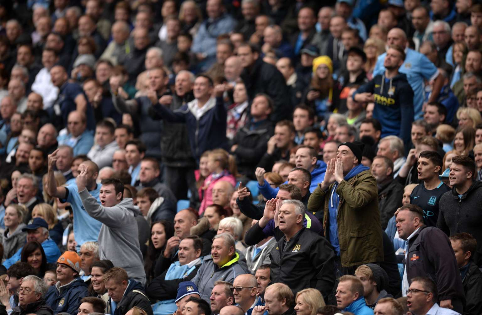 Manchester City fans gesture at the officials during the English Premier League football match between Manchester City and Newcastle United on Oct 3.