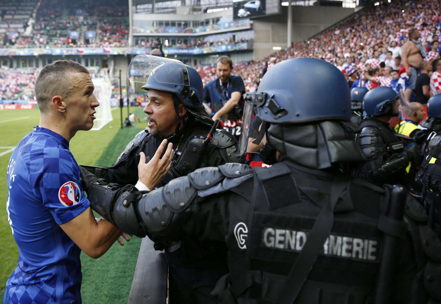 Croatia's Ivan Perisic (left) appeals to Croatia supporters after flares were thrown onto the pitch.