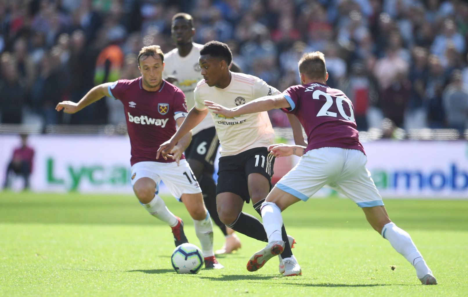 Manchester United's Anthony Martial (centre) in action during the match.