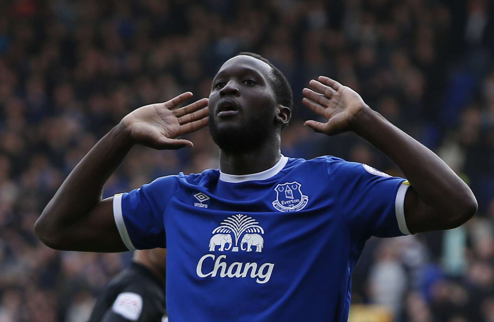 Romelu Lukaku celebrating scoring the third goal for former club Everton in their 3-1 win over Burnley in an English Premier League football match at Goodison Park in April 2017.