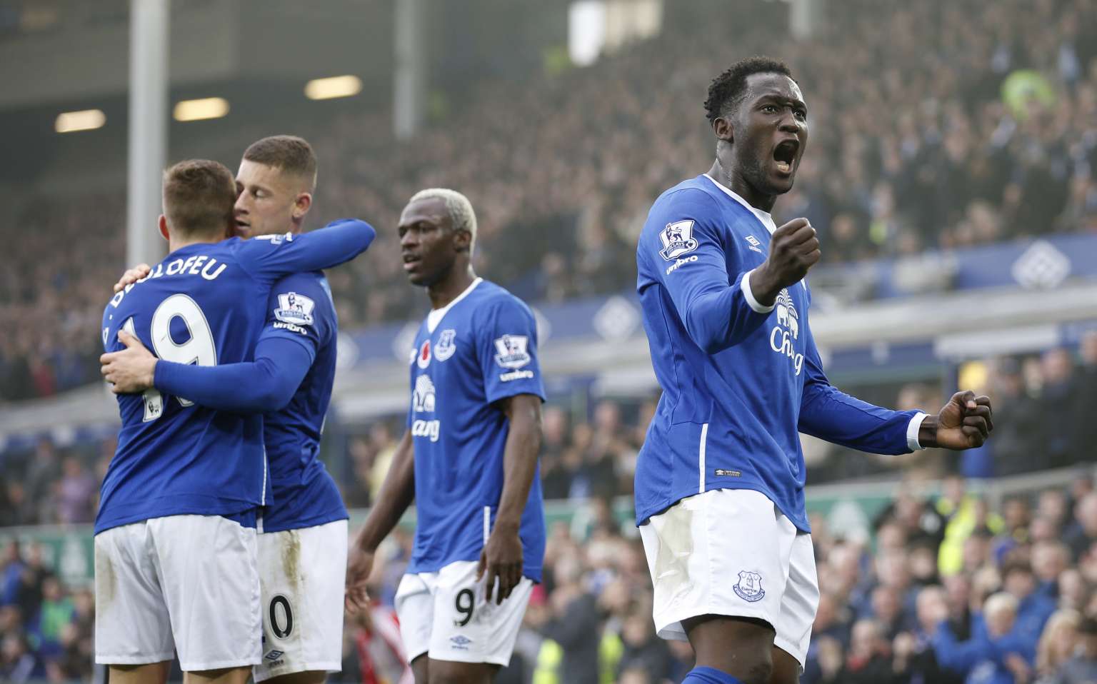 Everton players celebrate a goal.