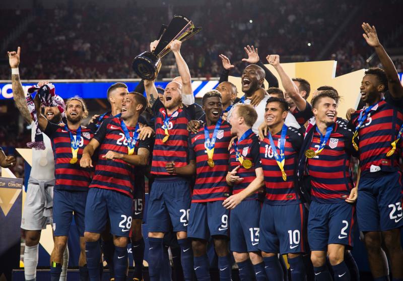 USA team captain Michael Bradley holds up the trophy as he celebrates with teammates after USA defeated Jamaica 2-1 in the 2017 CONCACAF Final.