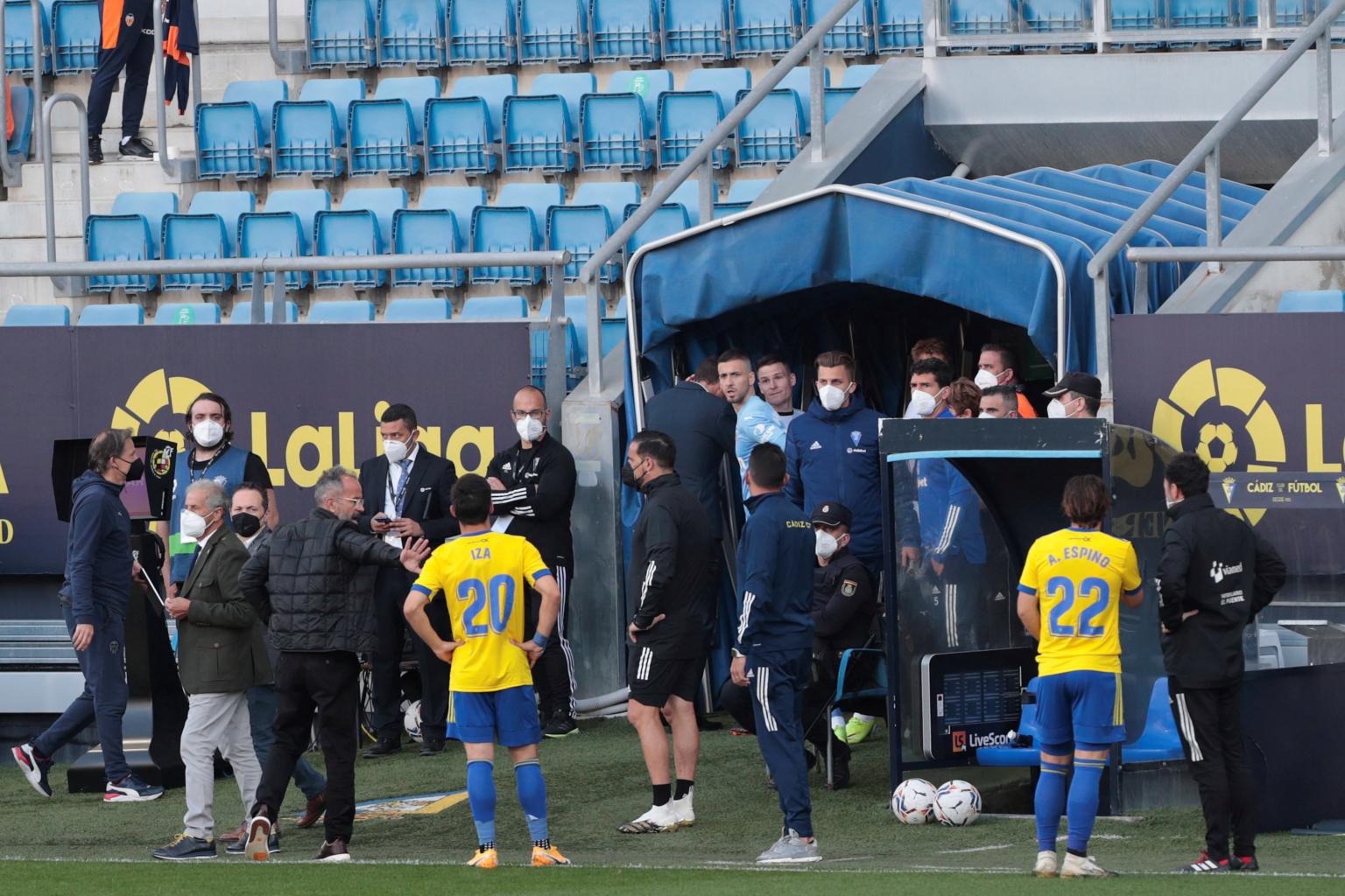 Valencia players leave the pitch during their Spanish La Liga soccer match against Cadiz at Ramon de Carranza stadium in Andalusia, Spain, on April 4, 2021.
