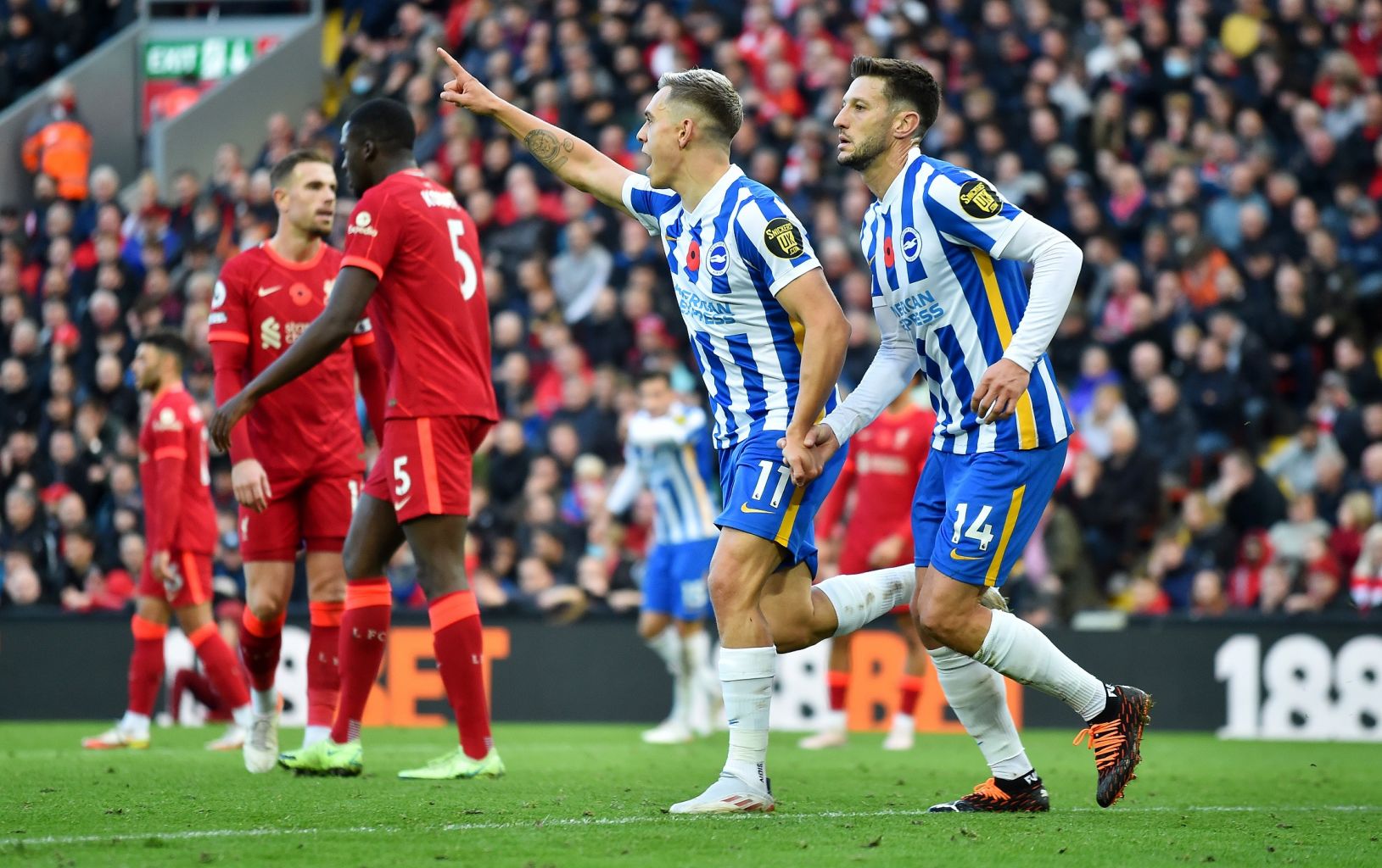 Brighton's Leandro Trossard (second right) celebrates after scoring the equaliser against Liverpool.