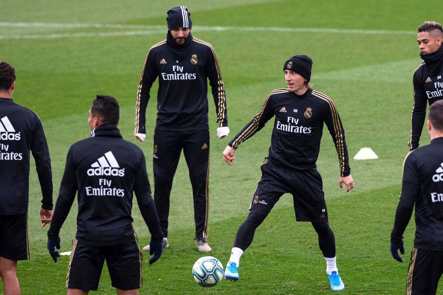 Real Madrid's Croatian midfielder Luka Modric (centre right) performs during his team's training session in Madrid.