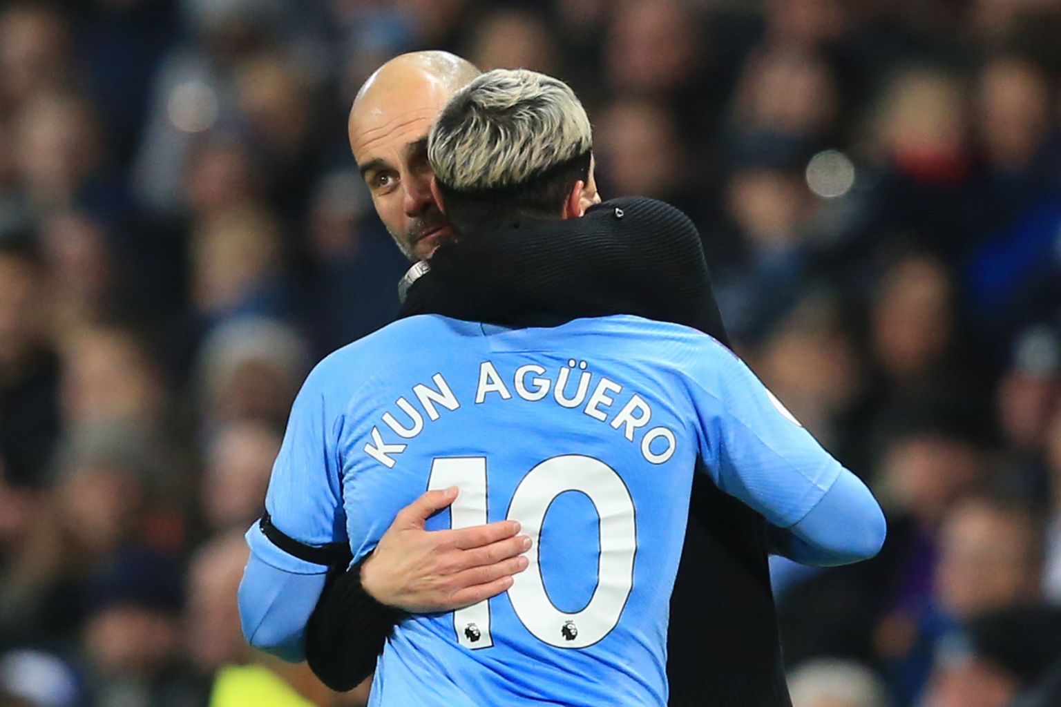 Guardiola embraces City's Argentinian striker Sergio Aguero as Aguero is substituted.
