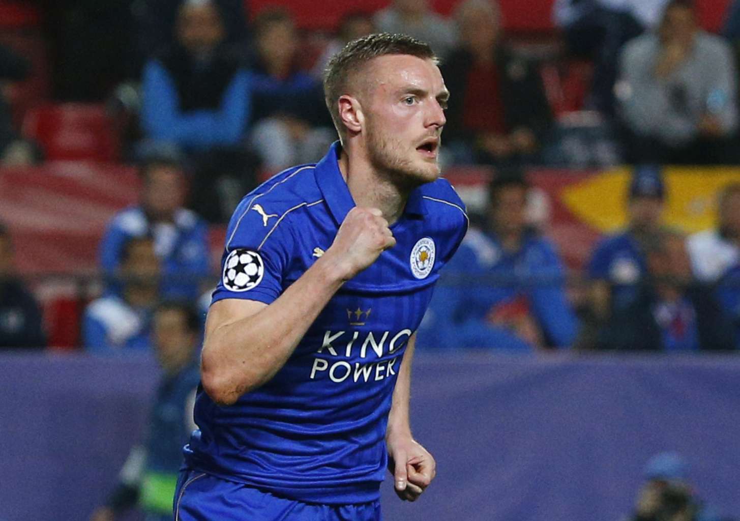 Leicester City's Jamie Vardy celebrates scoring their first goal at the UEFA Champions League Round of 16 First Leg in Ramon Sanchez Pizjuan Stadium, Seville, Spain on Feb 22, 2017.