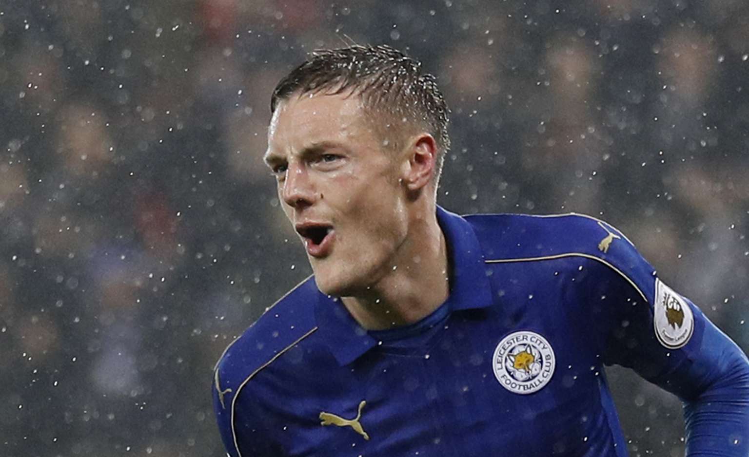 Leicester City's Jamie Vardy celebrates scoring their third goal.