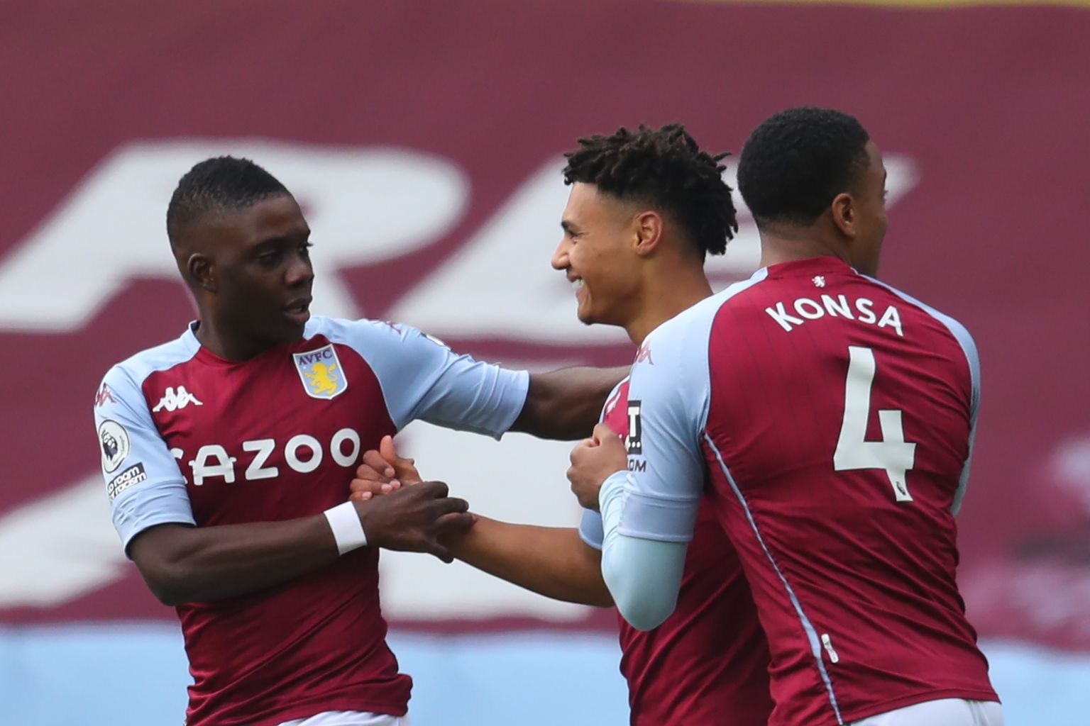 Aston Villa striker Ollie Watkins (centre) celebrates his goal with teammates.