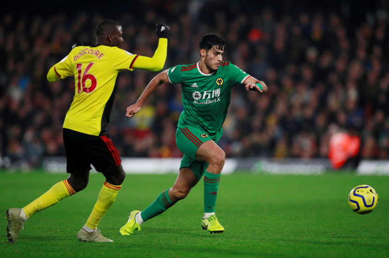 Wolverhampton Wanderers' Raul Jimenez in action with Watford's Abdoulaye Doucoure during their EPL match on Jan 1, 2020.