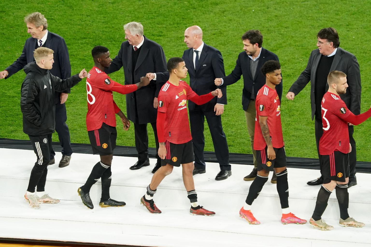 Manchester United's players look dejected as they wait to receive their runner up medals from UEFA president on May 26, 2021.