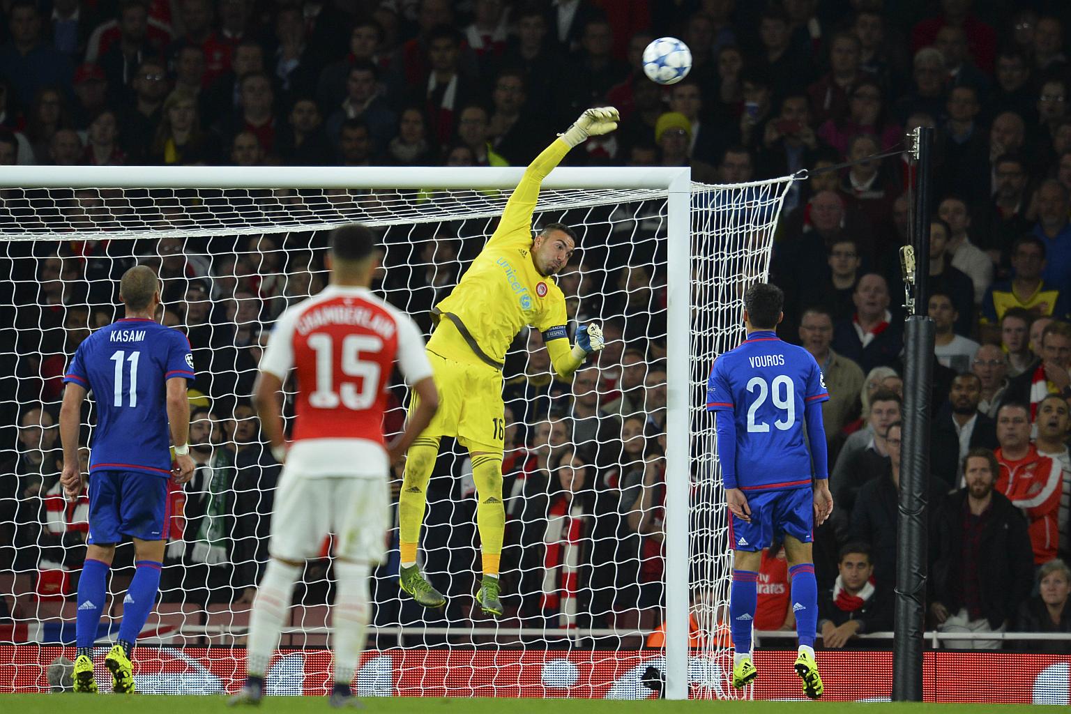 Olympiakos's Spanish goalkeeper Roberto Jimenez (second right) reaches high to tip a ball over the bar to make a save during the UEFA Champions League Group F football match between Arsenal and Olympiakos at The Emirates Stadium in north London on Sept 29, 2015.