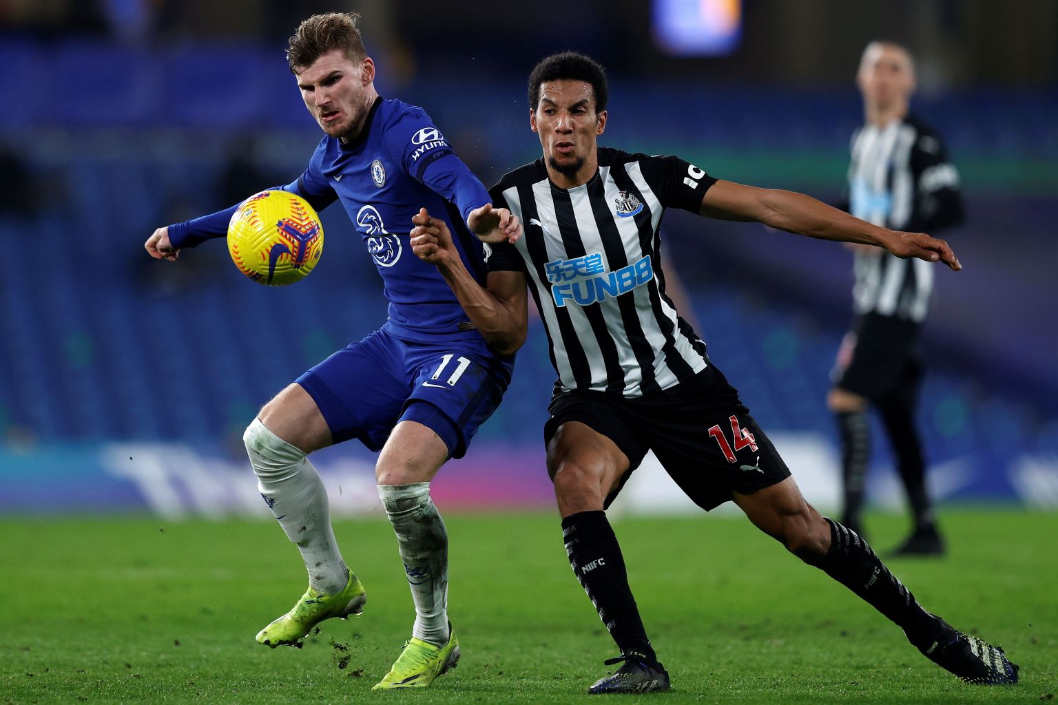 Chelsea's Timo Werner (left) vies with Newcastle United's Isaac Hayden on Feb 15, 2021.