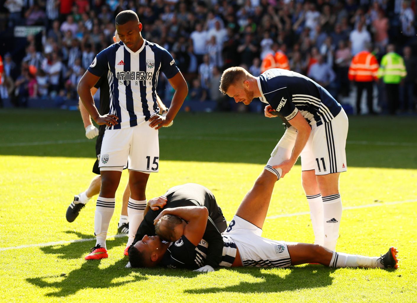 West Bromwich Albion's Jake Livermore celebrates scoring with team mates.