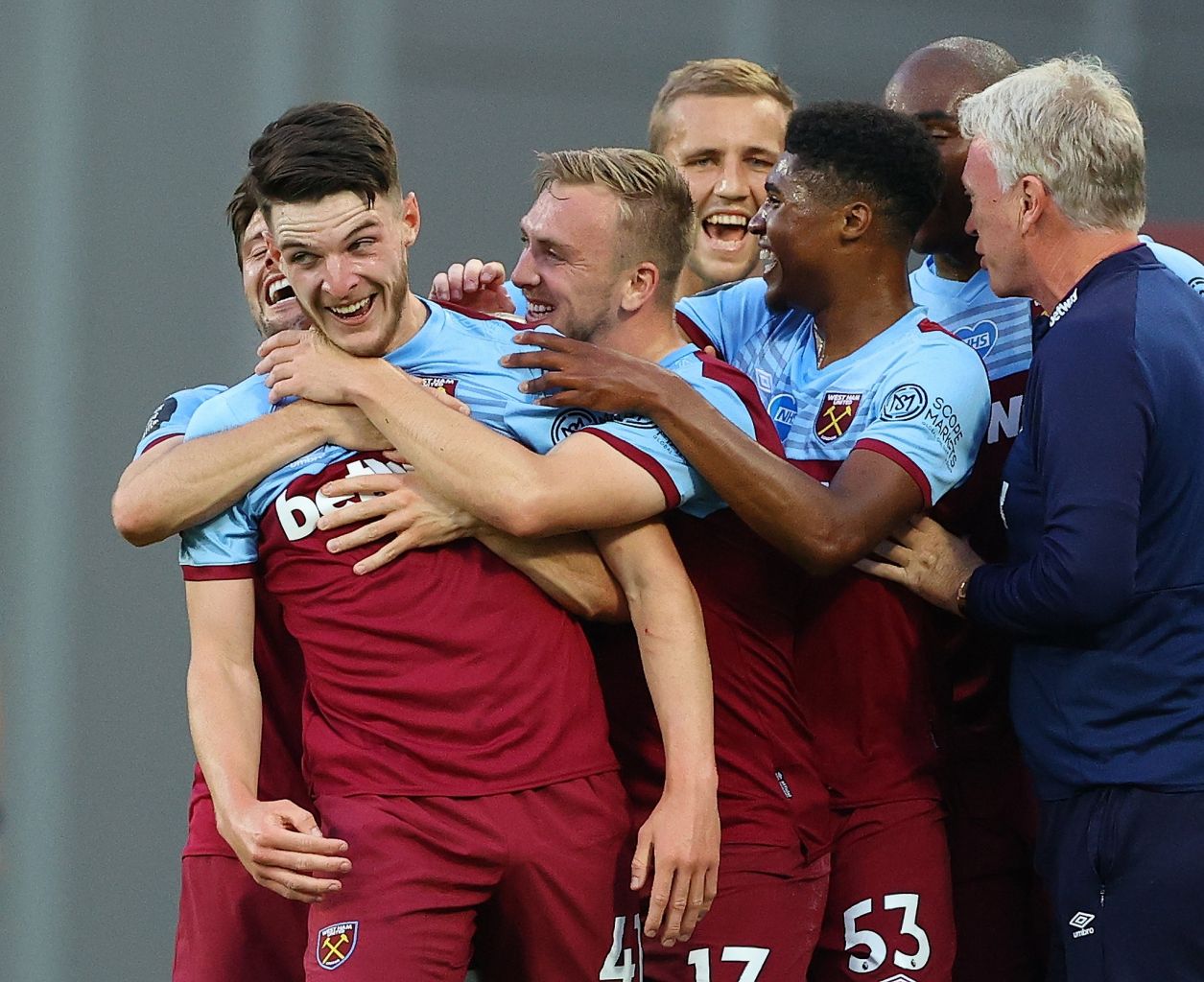 West Ham's Declan Rice (left) celebrates after scoring their third goal.