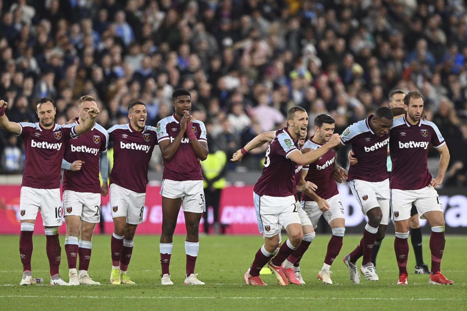 West Ham players celebrate winning their match against Manchester City after a penalty shoot-out.