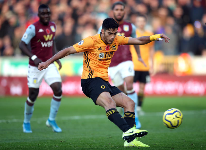 Wolverhampton Wanderers' Raul Jimenez scores his side's second goal during the English Premier League soccer match between Wolverhampton Wanderers and Aston Villa at Molineux on Nov 10, 2019.