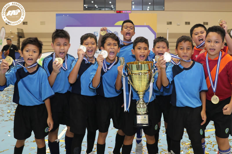 Young players from Woodlands Ring Primary celebrating after they were crowed winners of the Under-10 Singapore Pools-FAS Inter-School Futsal Challenge.