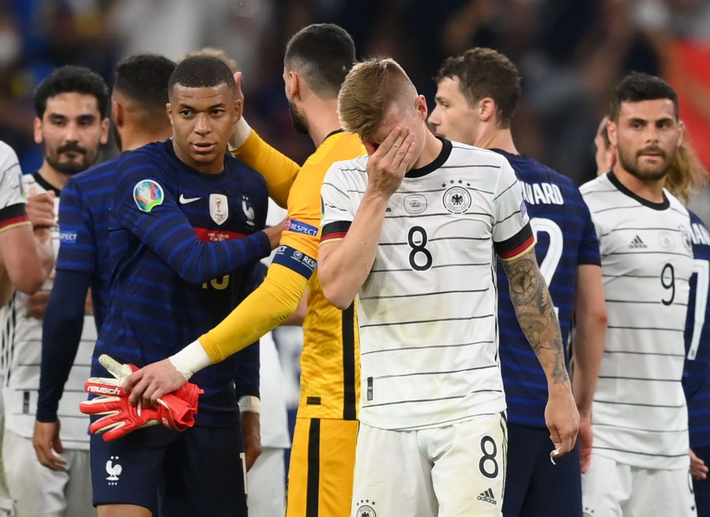 Germany's Toni Kroos looks dejected after the match as France's Kylian Mbappe looks on.