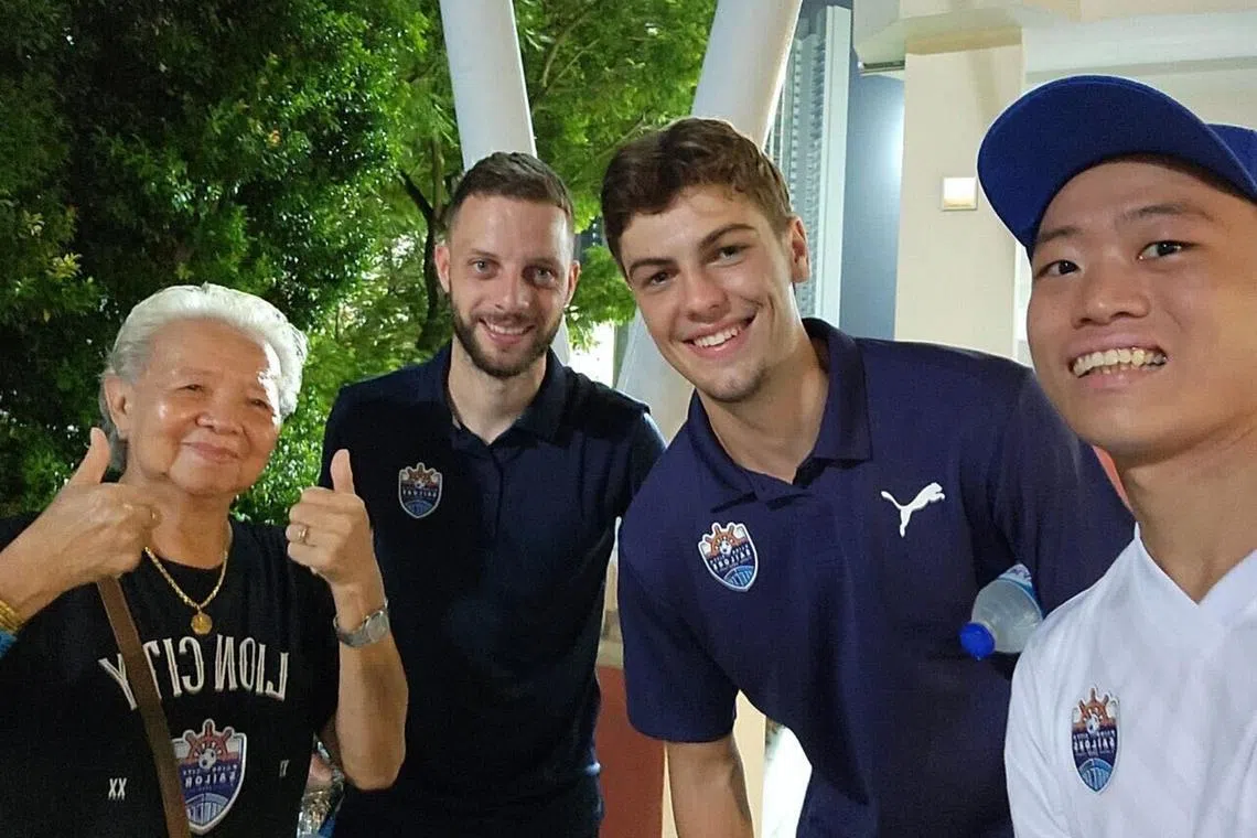 Auntie Ng taking a picture with Sailors players Bart Ramselaar, Obren Kljajic and grandson Quek Han Yew.