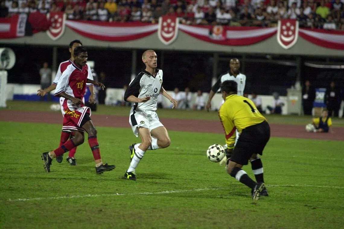 Former Manchester United midfielder Luke Chadwick tried his best but could get the ball past goalkeeper Rezal Hassan when the Red Devils faced Singapore in 2001.
