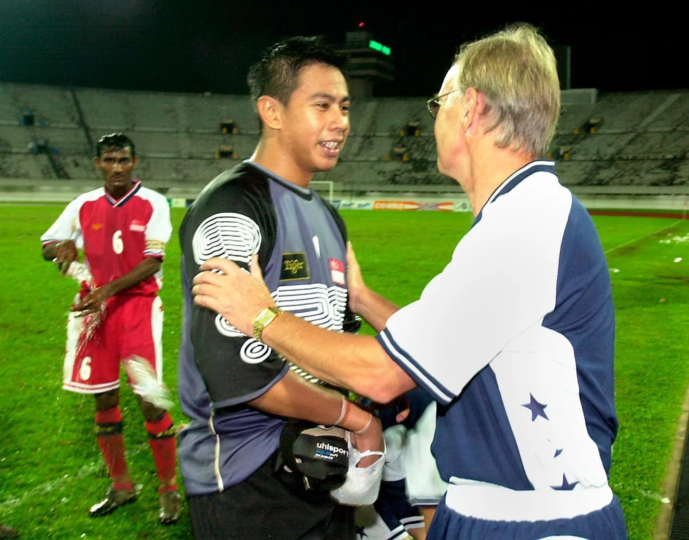Then national coach Jan Poulsen congratulates goalkeeper Rezal Hassan for making two saves in the penalty shoot-out to help the Lions beat Indonesia in a 2001 friendly.