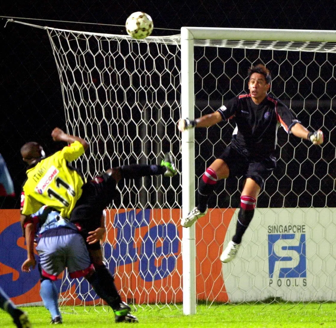 SAFFC’S Rezal Hassan spreads himself to block an attempt at goal by Woodlands Wellington’s Itimi Dickson (No. 11) in an S-League match in 2003.