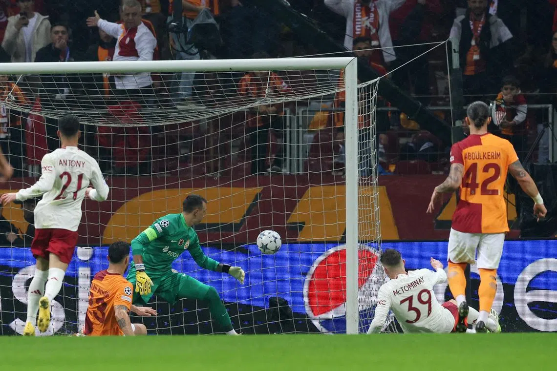 Galatasaray's Hakim Ziyech scores their second goal past Manchester United goalkeeper Andre Onana in the 3-3 Champions League draw.