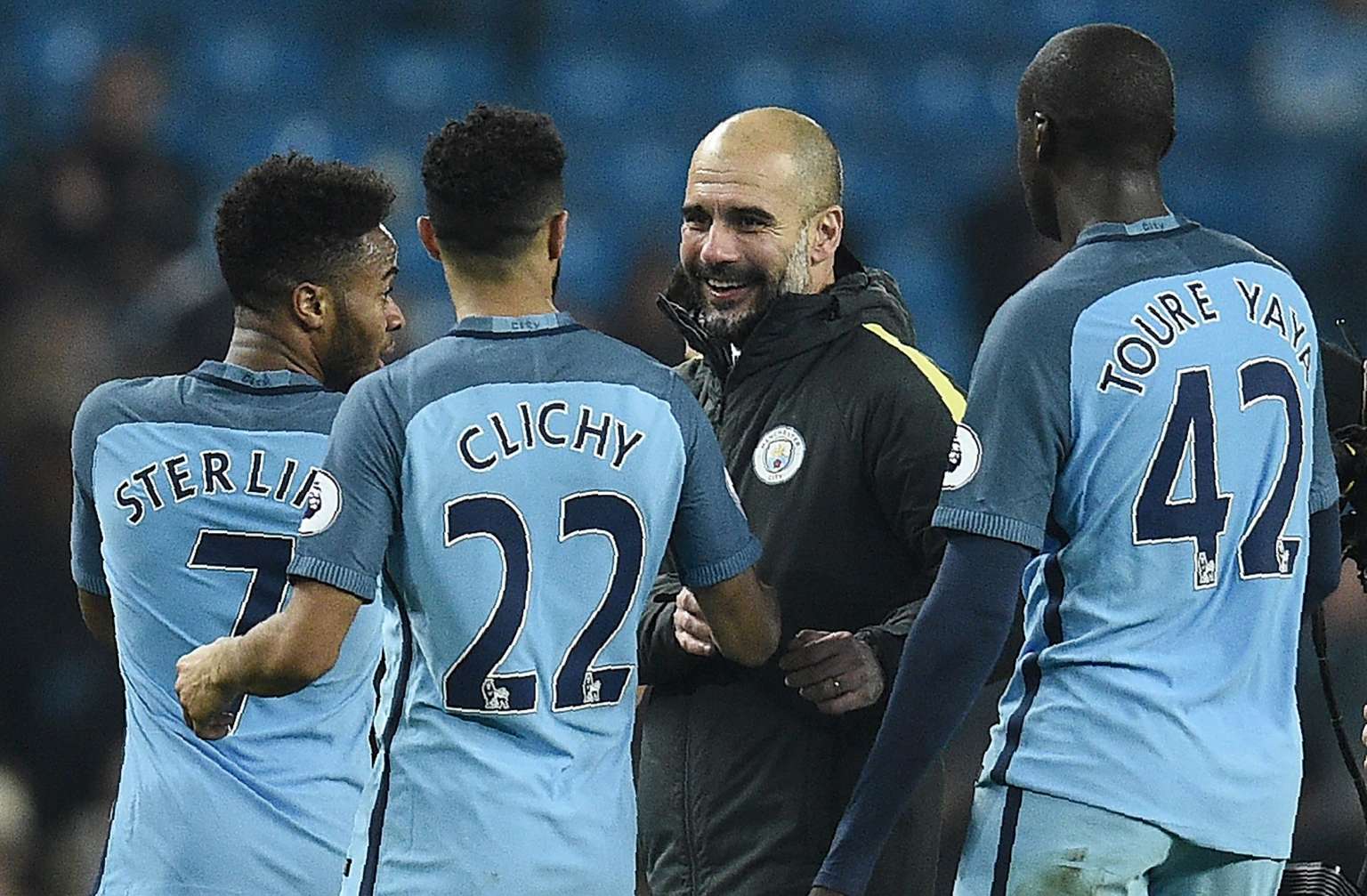 Guardiola congratulates Raheem Sterling, Gael Clichy and Yaya Toure after City's match against Arsenal on Dec 18, 2016.