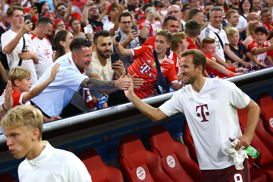 Bayern fans lined up hours before kick-off at Munich’s Allianz Arena to get their “Kane 9“ shirts printed at the club store as a buzz of anticipation accompanied the player’s first appearance.
