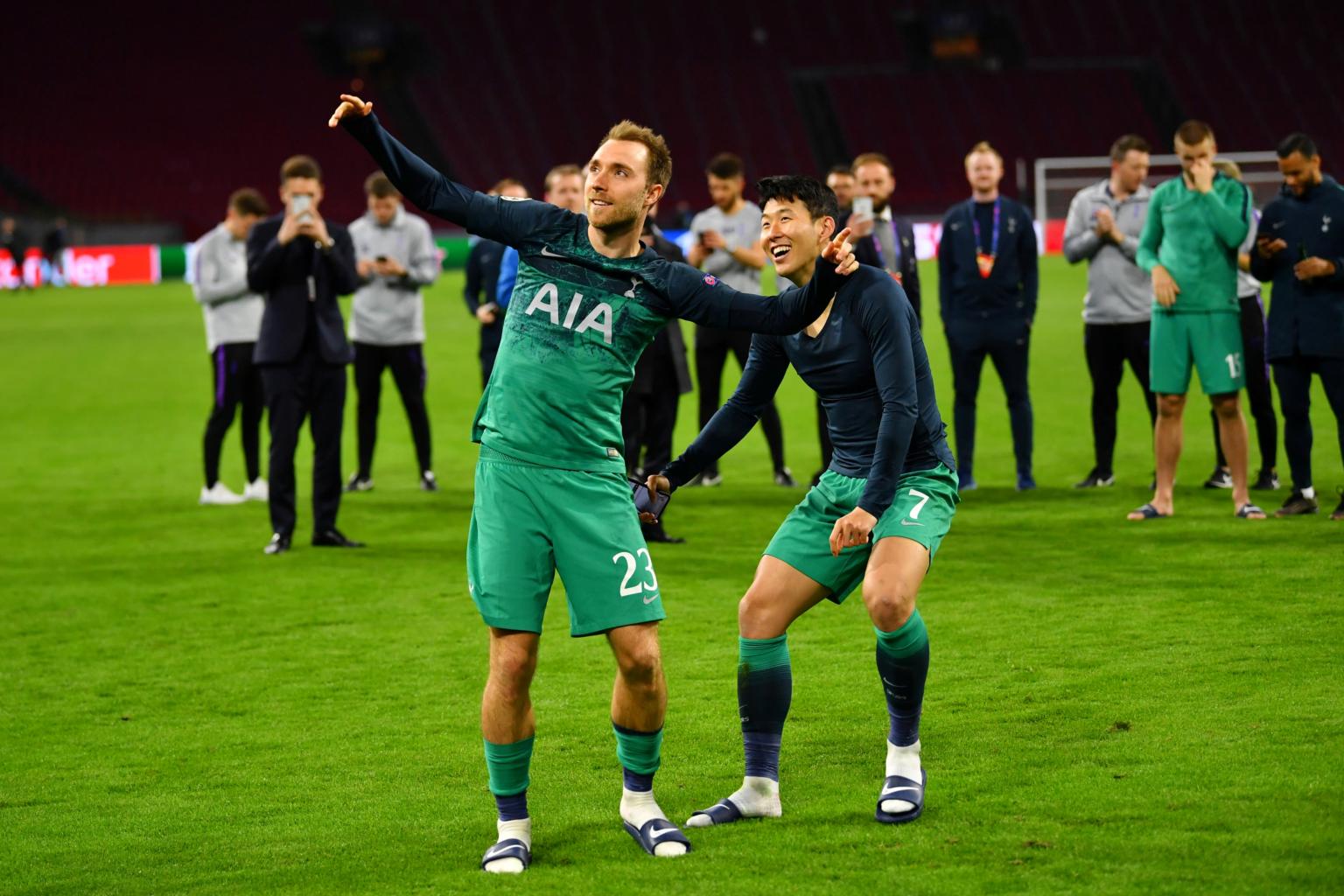 Tottenham's Christian Eriksen and Son Heung-min celebrate after the match against Ajax Amsterdam on Wednesday (May 8).