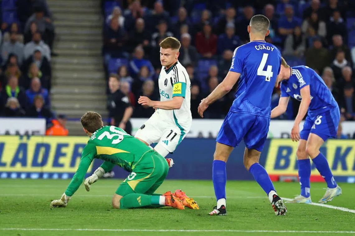 Newcastle’s Harvey Barnes scores their third goal against Leicester.