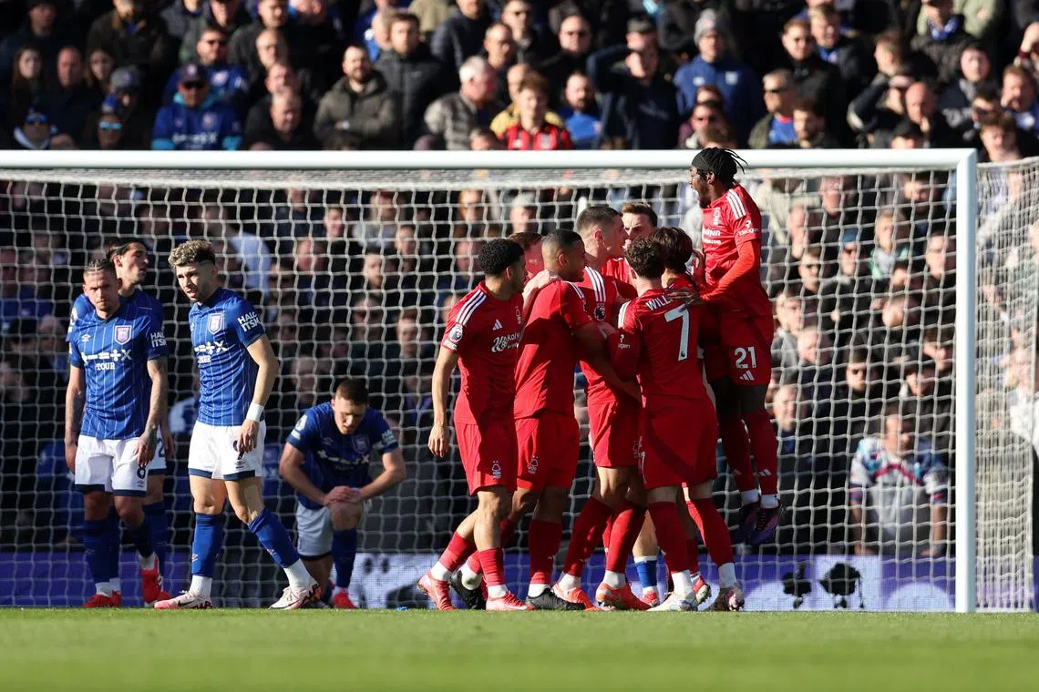 Nottingham Forest players celebrating Nikola Milenkovic’s goal against Ipswich on March 15.