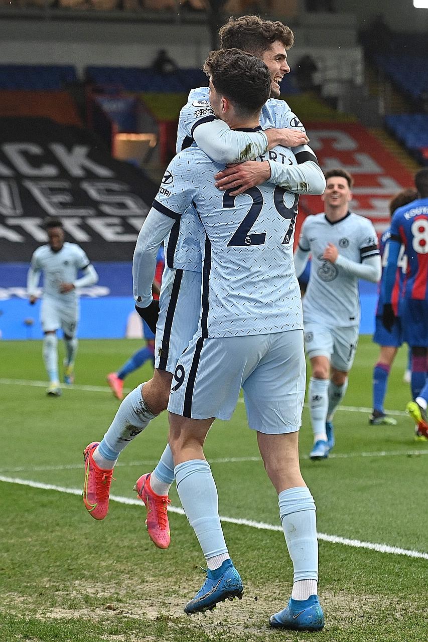 Chelsea's Christian Pulisic jumps on Kai Havertz to celebrate putting the Blues 2-0 up against Crystal Palace, after his fellow midfielder had given them the lead. The American also scored the fourth goal.