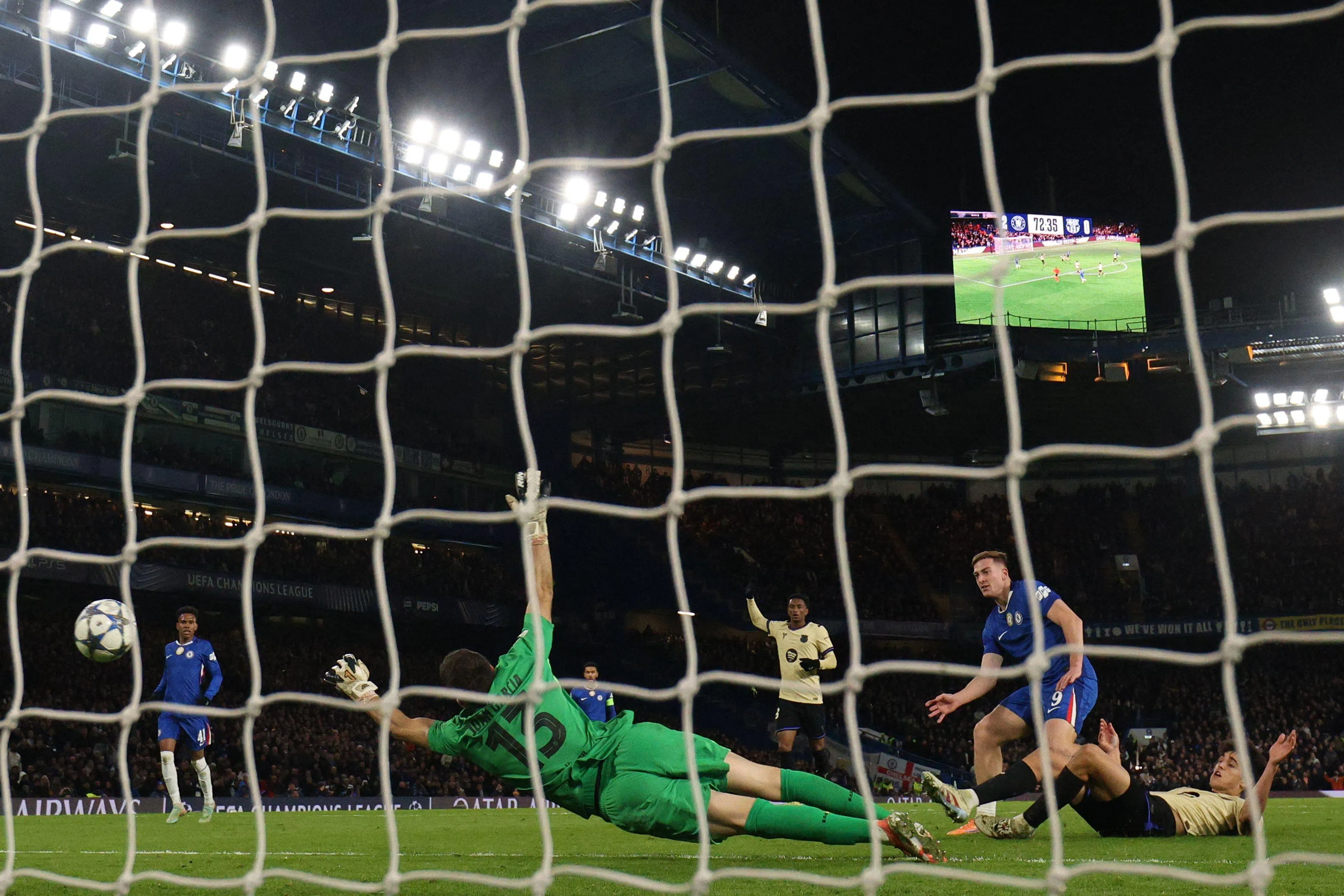 Chelsea striker Liam Delap (right) scores their third goal against Barcelona.