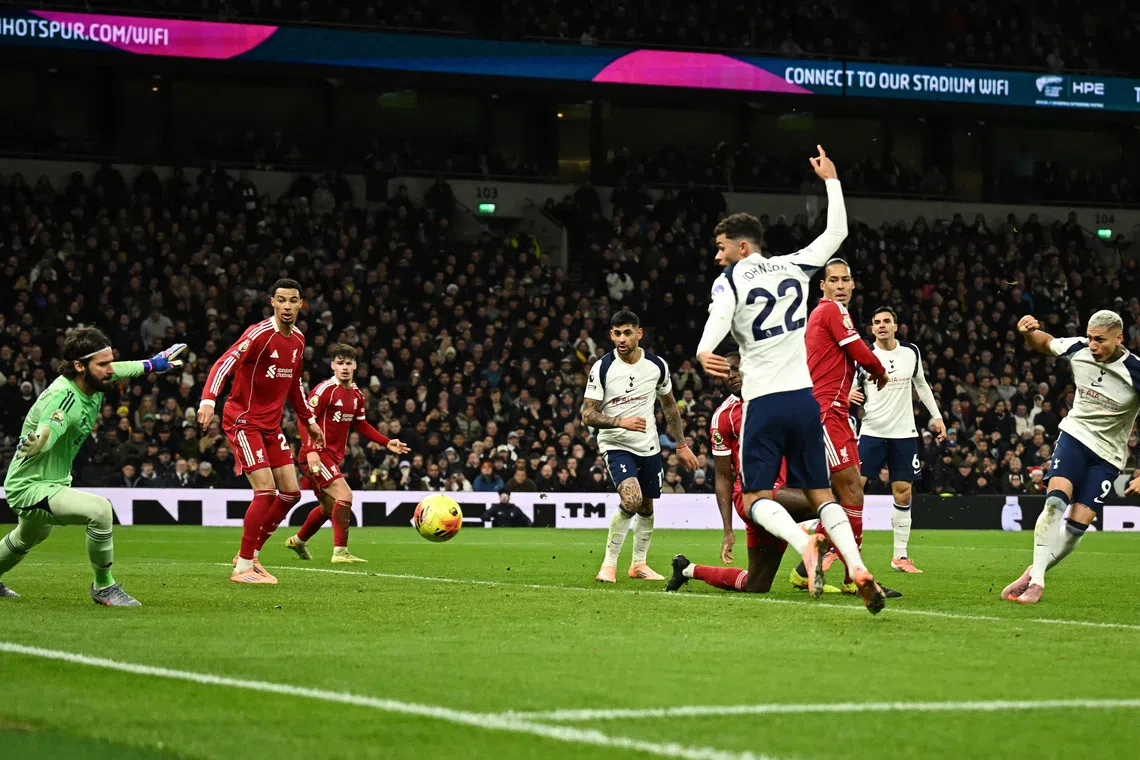 Liverpool's Alexander Isak (left) scores their first goal during the EPL match against Tottenham Hotspur in London, Britain, on Dec 20.
