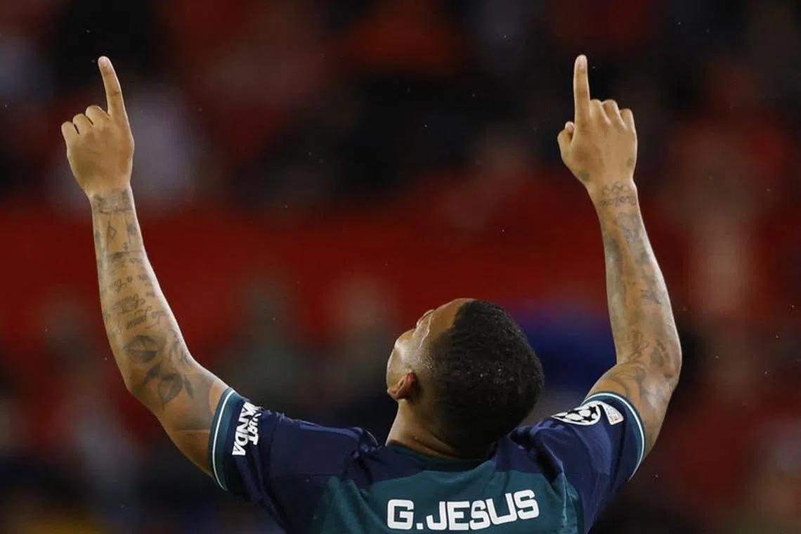 Arsenal’s Gabriel Jesus celebrates scoring their second goal in Seville, Spain, on Oct 24.