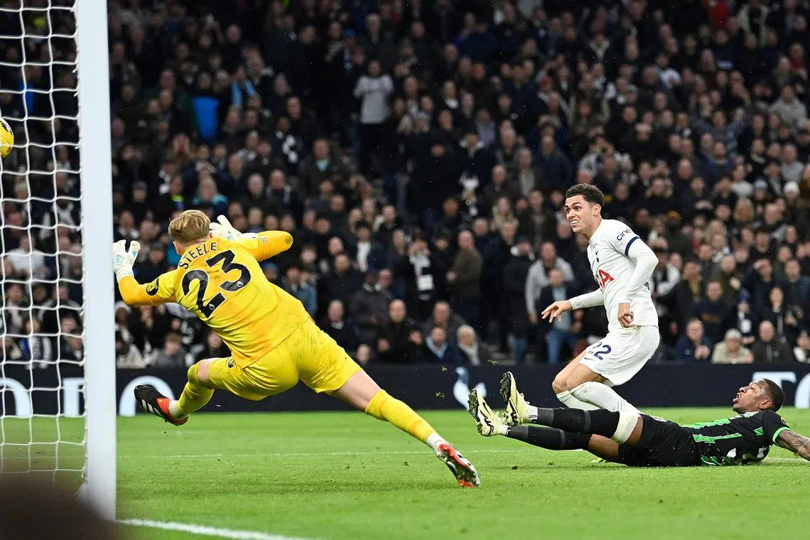 They had taken the lead in the 17th minute after Tottenham’s Micky van de Ven, who had already got away with one bad mistake, was penalised for fouling Danny Welbeck in the area and Gross sent Guglielmo Vicario the wrong way from the spot.