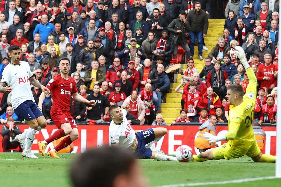 Liverpool’s Diogo Jota scores their fourth goal past Tottenham Hotspur’s Fraser Forster.