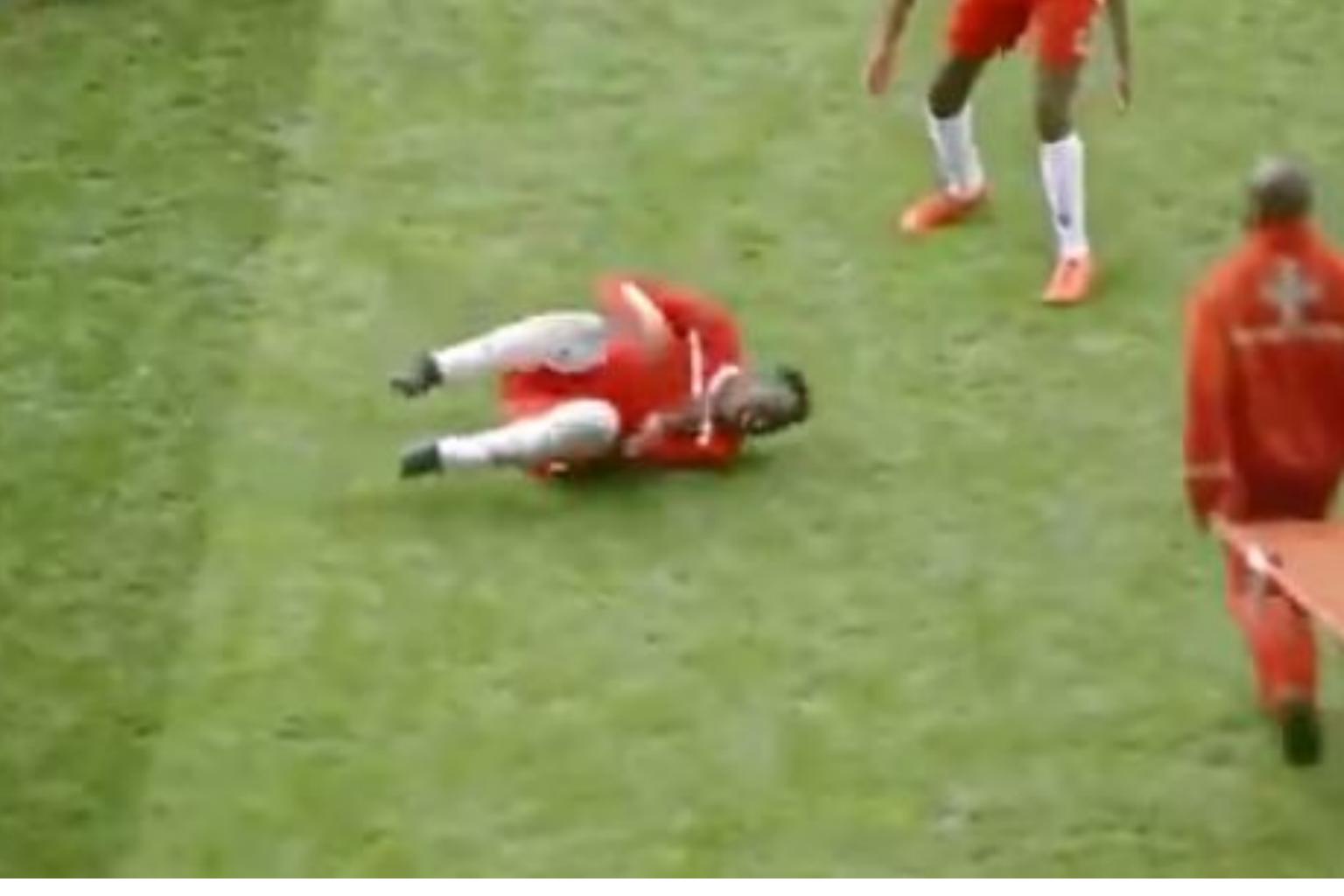 The player immediately fell down, clutching his right leg and screaming in pain before engaging in a series of rolls off the pitch.