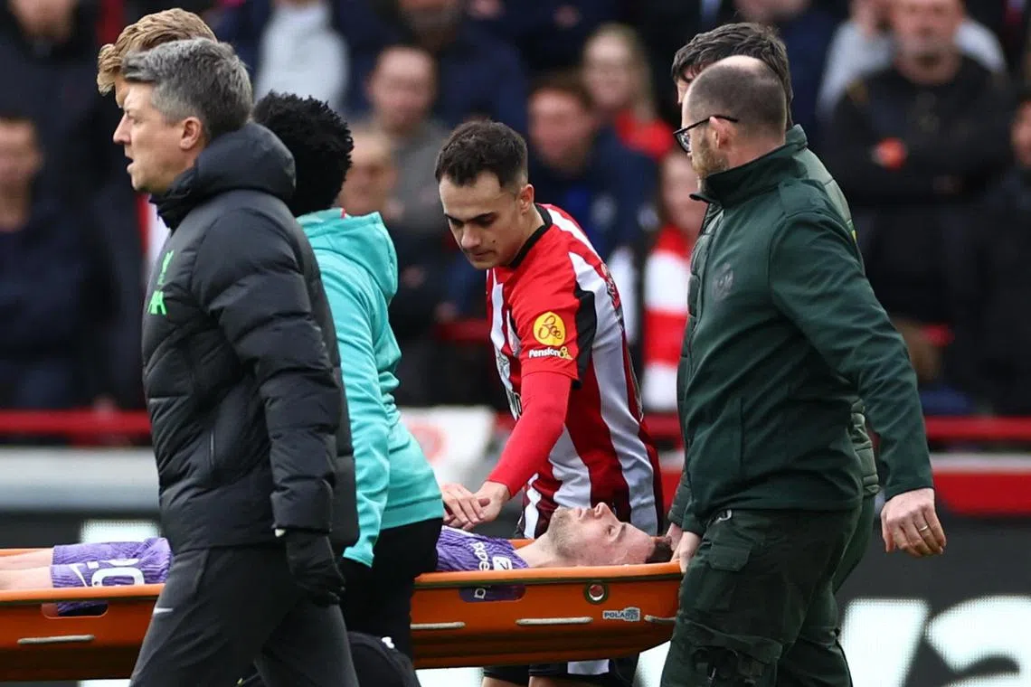 Liverpool's English midfielder Curtis Jones is treated by medical staff during the match against Brentford.