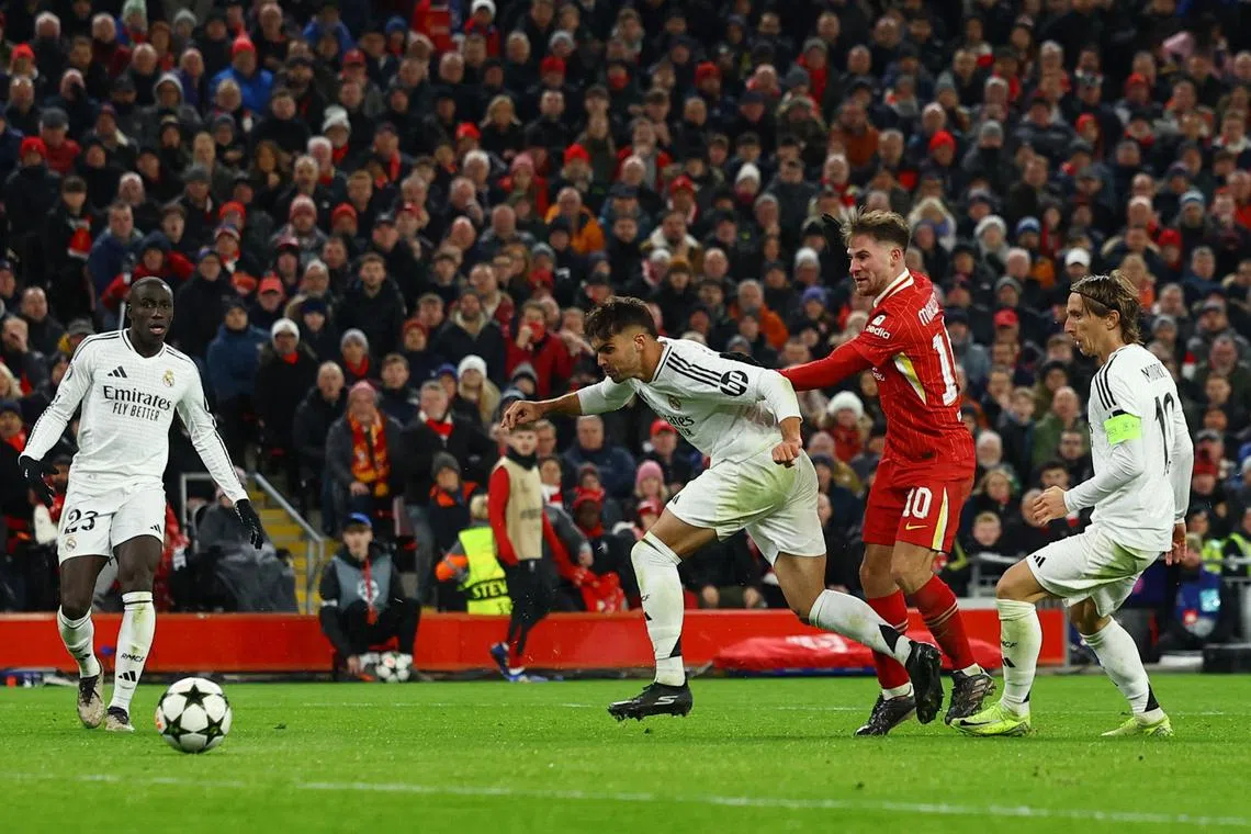 Darwin Nunez was sent in behind the Madrid defence by Salah and after his shot produced a fine save from Thibaut Courtois, Asencio reacted smartly to prevent the rebound bouncing off him and into his own net.