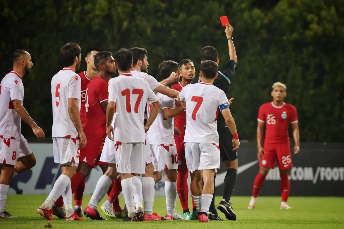 Singapore’s Adam Swandi was sent off after lashing out at Tajikistan’s Tabrez Islomov.