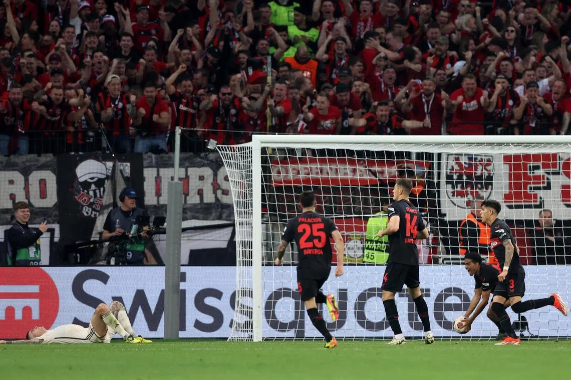 LEVERKUSEN, Germany - Bayer Leverkusen are through to the Europa League final 4-2 on aggregate after a stoppage-time goal from Josip Stanisic snatched a 2-2 draw at home on May 9, extending their unbeaten run to a record 49 games.